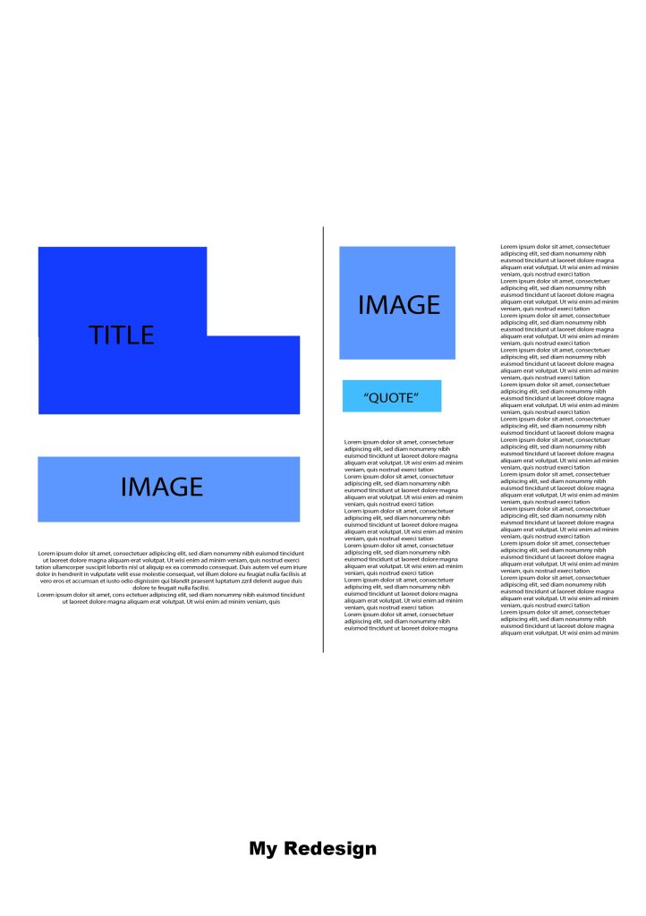 For the left text column, I would bring it down lower than the right to create some slight asymmetry and to avoid the text looking intimidating. By breaking down the sizes of the text boxes, it appears less like an essay to the viewer and creates a break visually. The right text box descends vertically down the entire page, forming vertical lines to break the horizontal ones, which is also accentuated further by the spacing between columns, creating a more flattering and inviting composition to this spread.