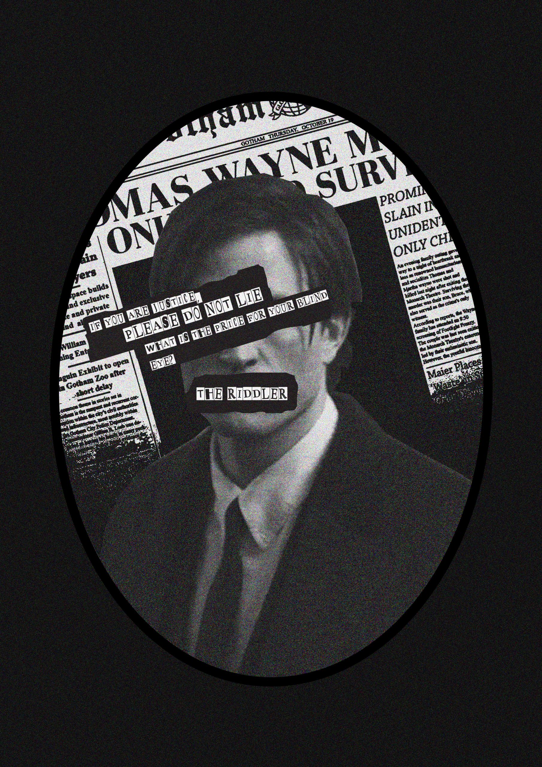 I have taken inspiration from punk design to create this poster. It shows Robert Pattinson as Bruce Wayne, from The Batman. In the movie, The Riddler (villain) sends anonymous letters in a ransom note style. I have copied this by layering news papers from the film and a photo of Bruce Wayne. I covered his eyes to create anonyminity, and placed one of The Riddler’s quotes there, using a ransom-note font. I also added ‘The Riddler’ on the mouth as a sign off. I was inspired by the work of Jamie Reid, so I placed the image in a oval shape, similar to his design for the Sex Pistols.