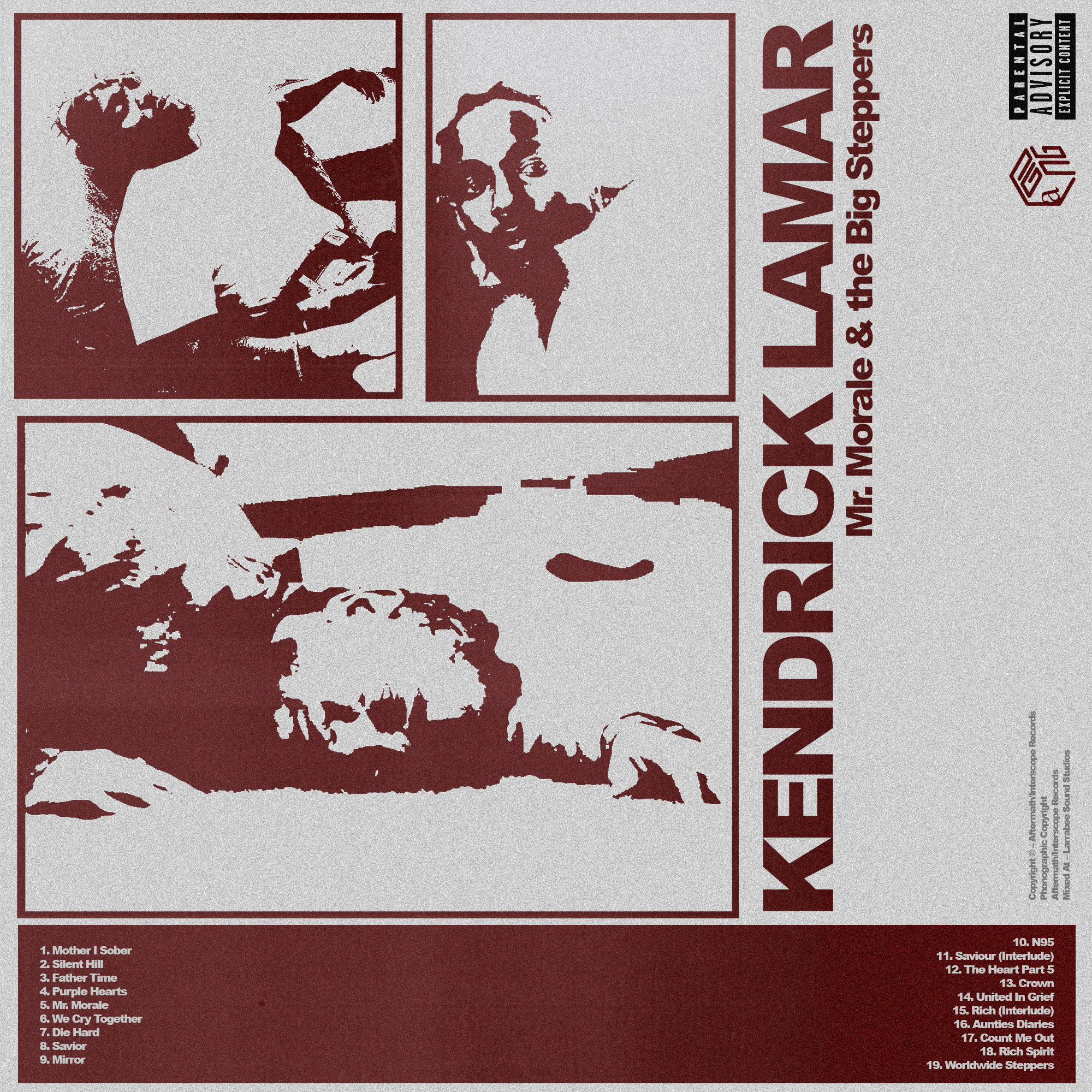 This is a design I made for Kendrick Lamar’s new album, Mr Morale And The Big Steppers. I screenshotted images from his music video and manipulated them with the threshold tool for a gritty look. I arranged them into three rectangles, with the largest image at the bottom for balance. I added a maroon outline, matching the colour of the design. I added a rectangle, where I placed the track list. I halved the list and placed them at either side to create more balance horizontally. I added the album title and artist, running vertically for leading lines. I also added information such as the copyrights, record label, and an explicit warning for a more authentic album cover effect. I added noise for some grain and texture to finish.