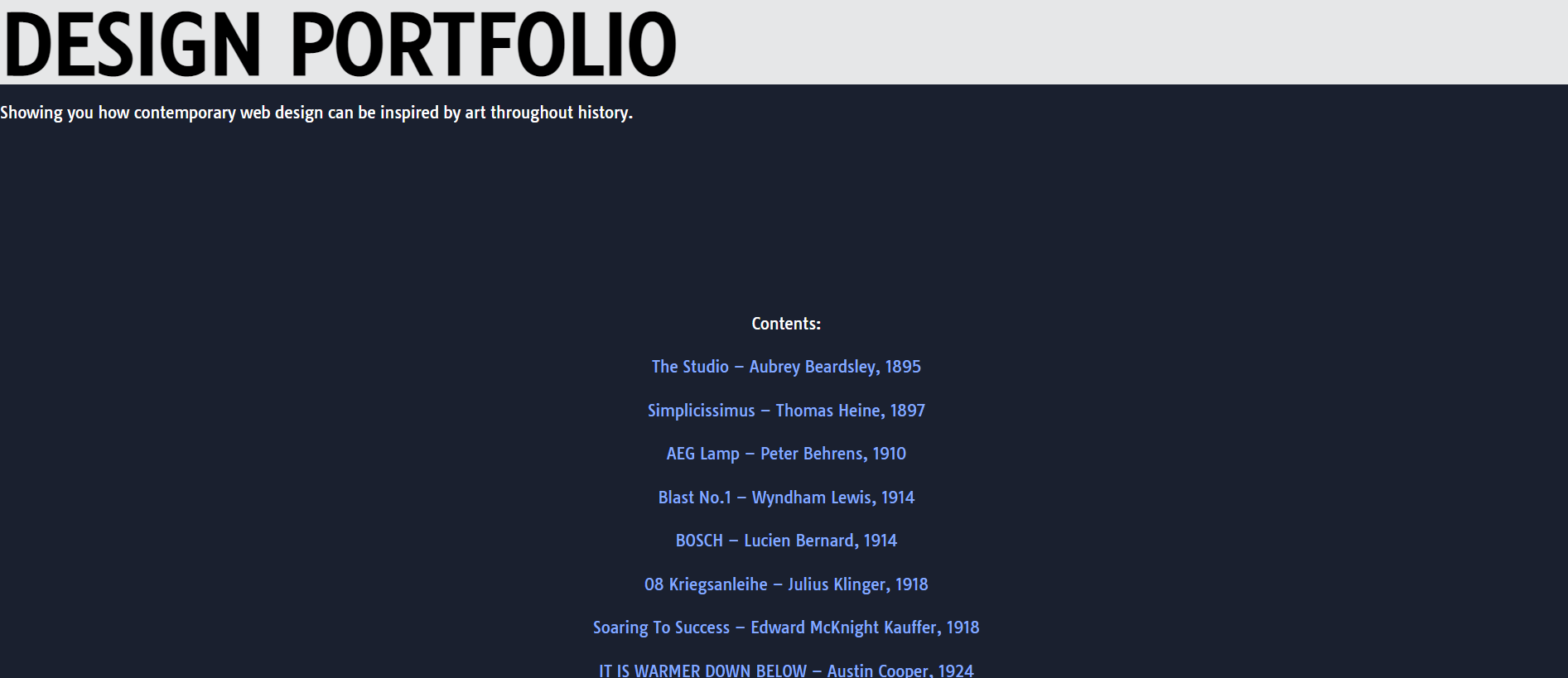 The colours I have used are black, white, dark blue, and light blue. I wanted a professional and clean appearance and didn’t want too much colour to distract from the designs. I used white for regular text, black for the website title, dark blue for the background and light blue for links. I also chose to use one font, which was a sans-serif clear font that can be easily read on screens.