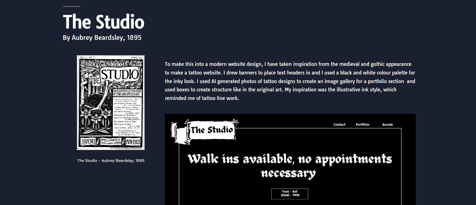 The idea from my layout was one that I did in my paper prototypes, with the images swapping sides. I made a few adjustments so that it worked better, like keeping text to all one side. I kept the text all to the left besides the original art and above my recreation. This way is better as the user can view it in an upside down L shape from Original-Text-Redesign, which creates a natural viewing flow and is more pleasant.