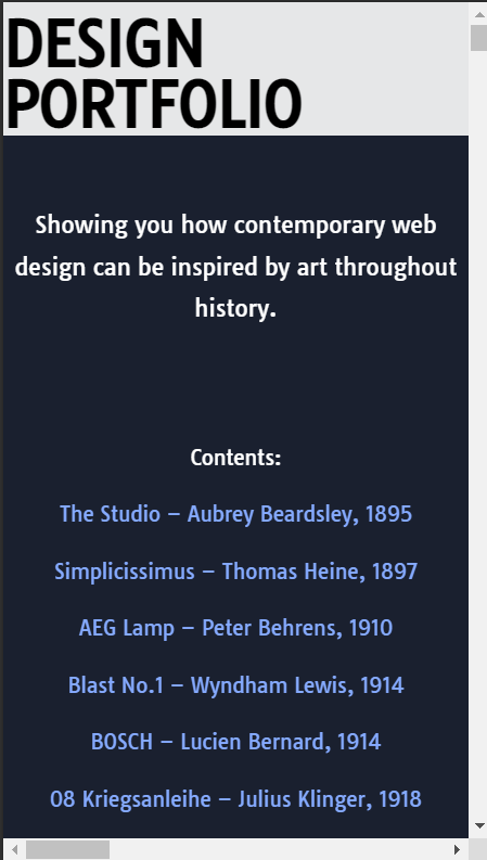 I instead just made a contents, which is placed in the centre to avoid an unbalanced space as the text reads down. I just put the artworks in order and linked each title to the section so users can click to a point. This also brings in the timeline aspect a little bit better as you can see everything all at once in order.