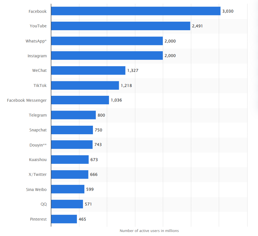 Statista (2023) Most popular social networks worldwide as of October 2023, ranked by number of monthly active users [Image]. Available online: https://www.statista.com/statistics/272014/global-social-networks-ranked-by-number-of-users/ [Accessed: 05.11.2023]