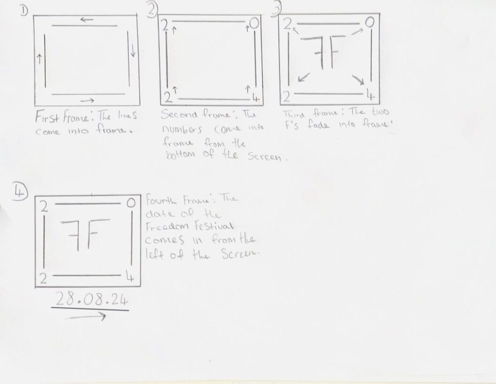 Because my secondary logo has more elements, I was able to create a more sophisticated sequence which takes the user through more of a visual journey. The first step is the lines extending from each corner in different directions. Then the numbers float up in sync, using the same technique as my first animation. The animation ends with the two F’s floating into the frame, and the date of the festival sliding in from the left, underneath the logo.