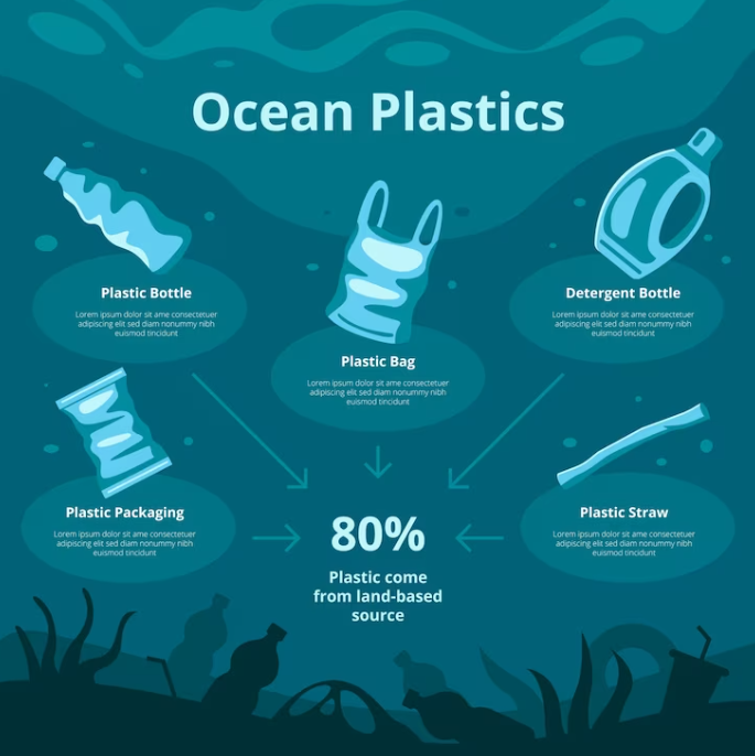 FreePik (ND) Hand Drawn Ocean Plastic Pollution Infographic [Image] Available online: https://www.freepik.com/free-vector/hand-drawn-ocean-plastic-pollution-infographic_41775458.htm [Accessed: 04/02/2024]