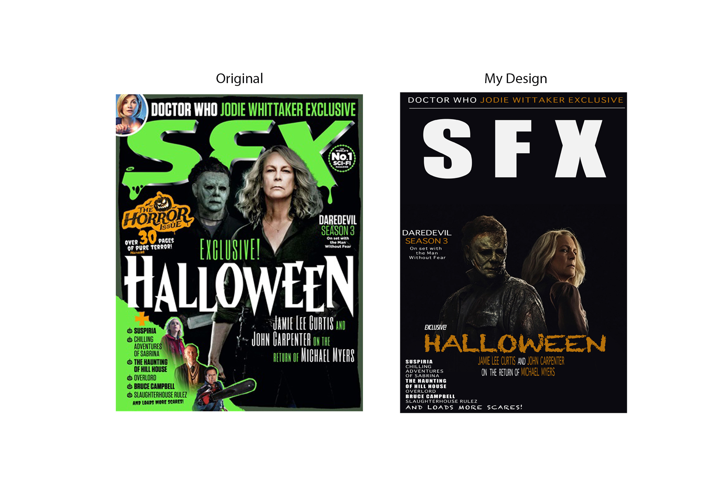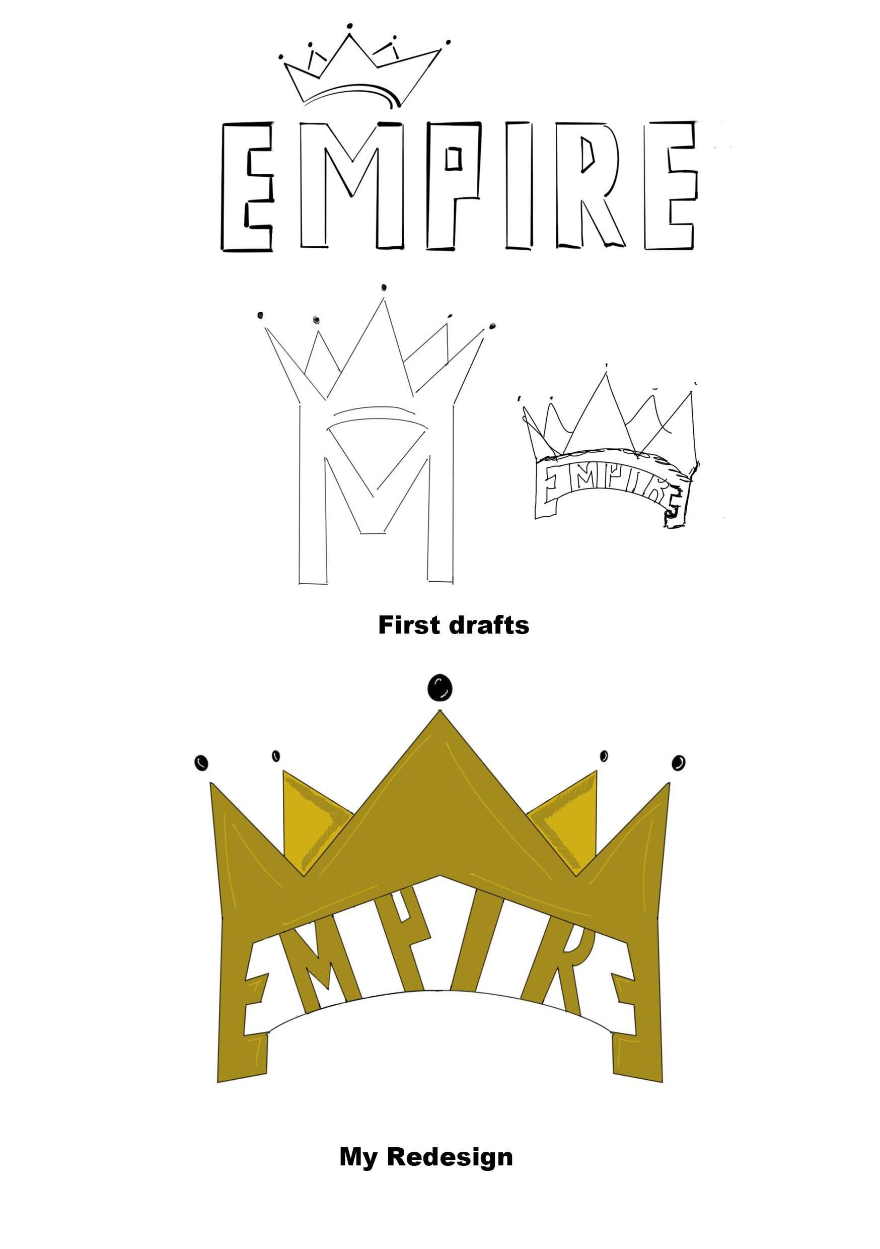 This is a masthead for Empire magazine. This logo doesn’t employ conceptual design and is instead a bold, impactful sans-serif typeface. I think the intention of this logo was to appear strong and dramatic, since Empire focuses on major film and TV news. I have redesigned this logo to appear more conceptual, taking inspiration from the boldness of the original masthead. I began brainstorming words associated with Empire and came up with the concept of a crown to suggest regality and pride. In my first sketches, I illustrated the crown hovering over the M in Empire, but I felt as though it didn’t really merge with the design and didn’t seem to flow very well. I then thought of just using the singular M, this time with the crown replacing the points of the letter, conjoining the two more seamlessly. I liked this but thought it it would more likely be seen as ‘M Magazine’, and not ‘Empire’. I then experimented by having the word be fit into the band of the crown, with each corner being mirrored and turned into E’s. This design felt more conceptual and appeared dramatic and theatrical, which reflects the theme of the magazine. The masthead also has a sense of symmetry which makes it appealing to the eye due to the two E’s at the beginning and end of Empire are mirrored. I kept the lettering within the crown as a sans-serif typeface as I felt that using a serif typeface would clash too much with the rest of the design, which already has a lot going on, so the more simplistic typeface keeps a sense of balance in the design.